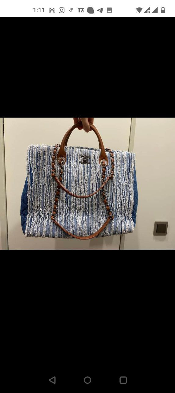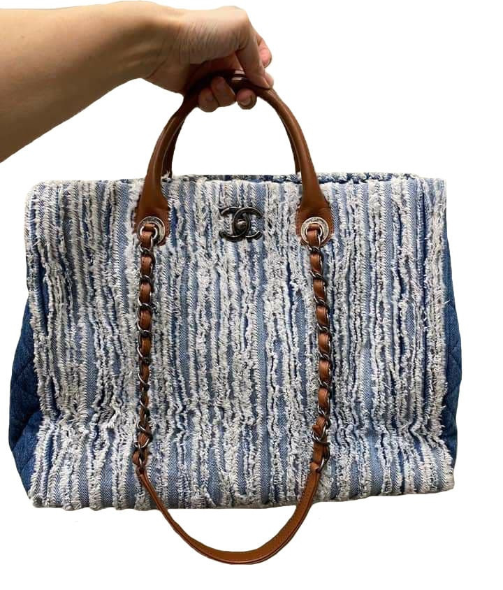 Authentic pre-owned Chanel Chanel Denim Fringed Large Shopping Tote Bag. Like new. Collection 2016. Retail price 4900$.Made of high-end blue denim with stylish fringe trim, quilted sides, and leather trim, the bag attracts with its classic tote shape. The item is complimented with two sets of handles and a CC closure. With brown rolled leather handles and a dual chain-link and leather handles, this roomy model can be worn in different ways, helping fashionistas create unique outfits and look irresistible.