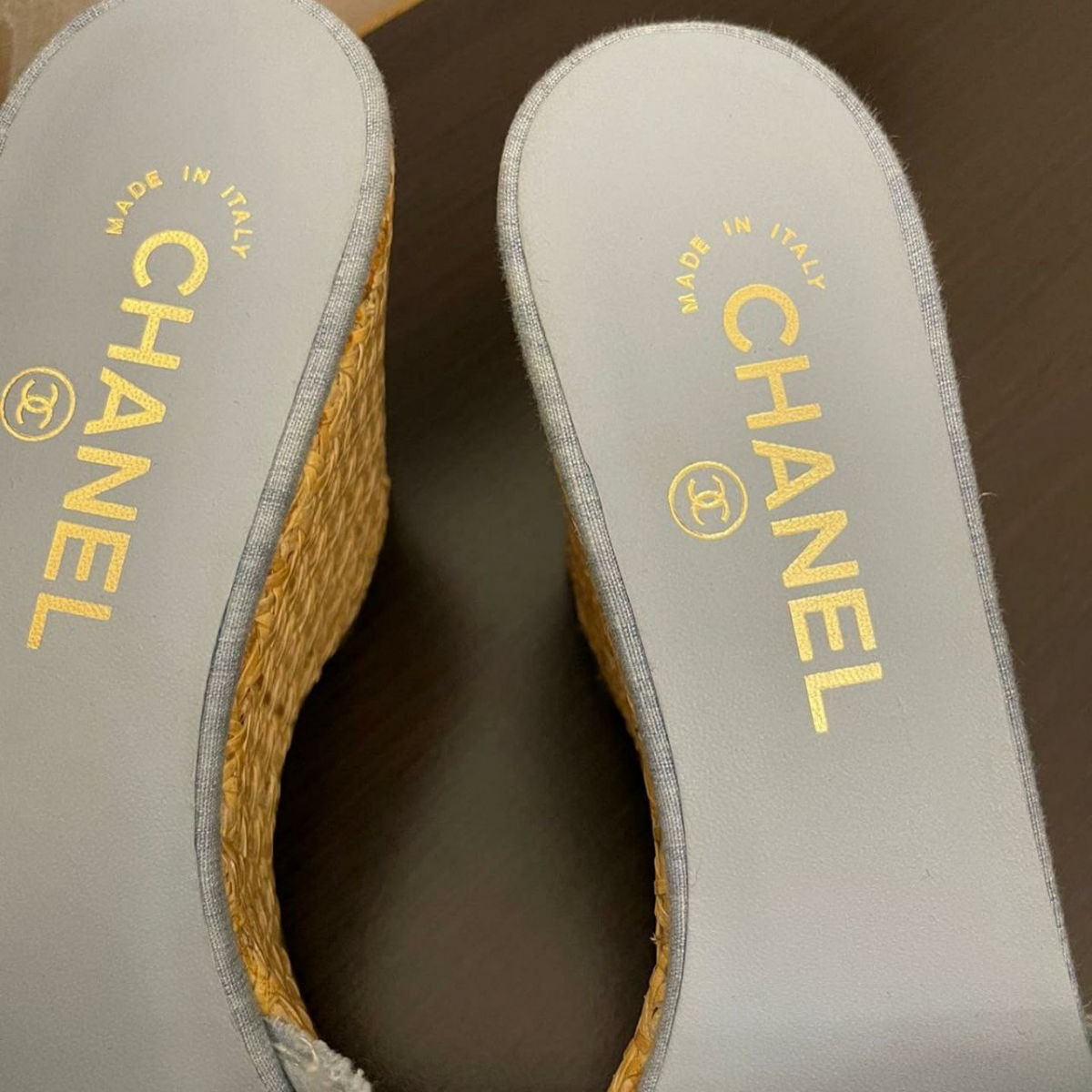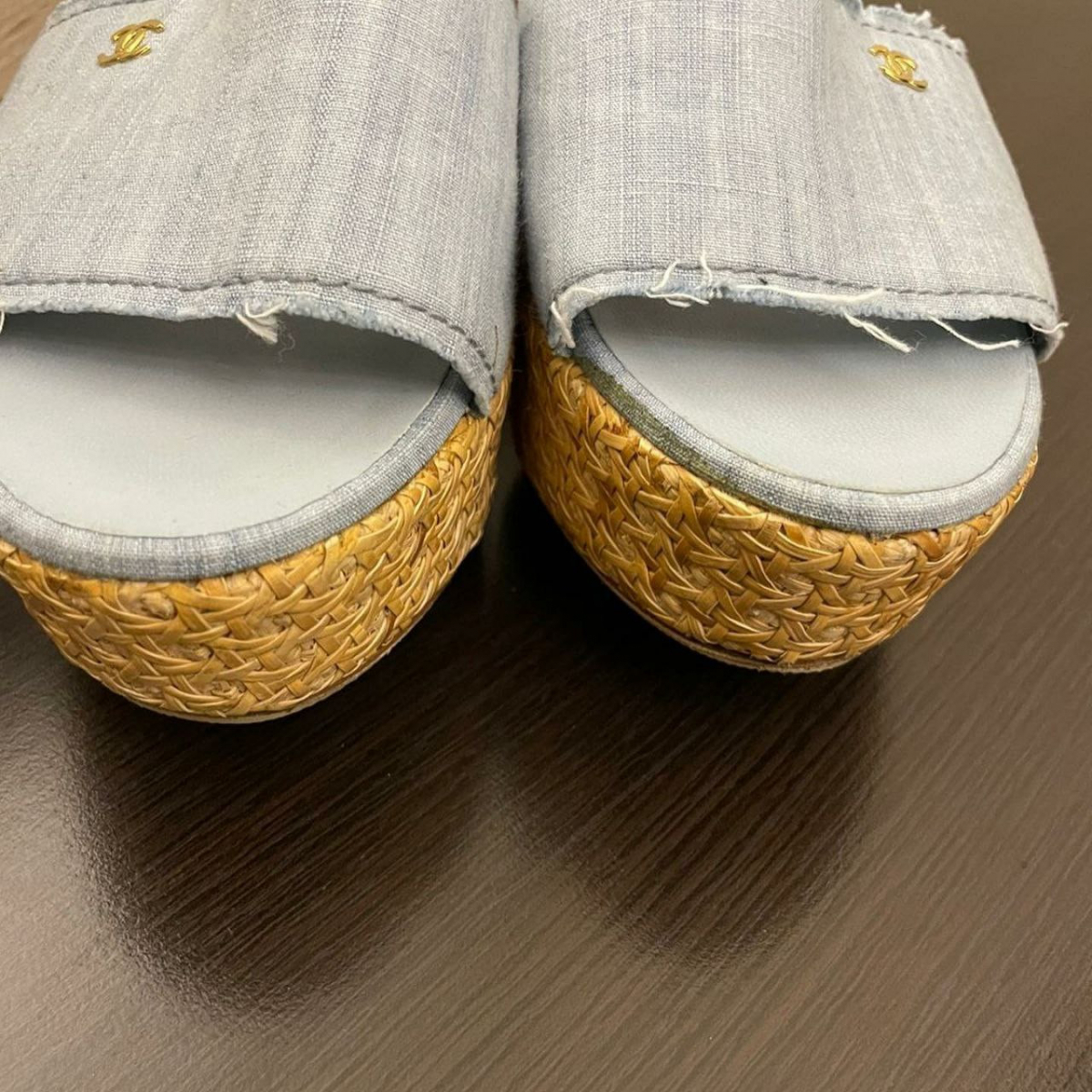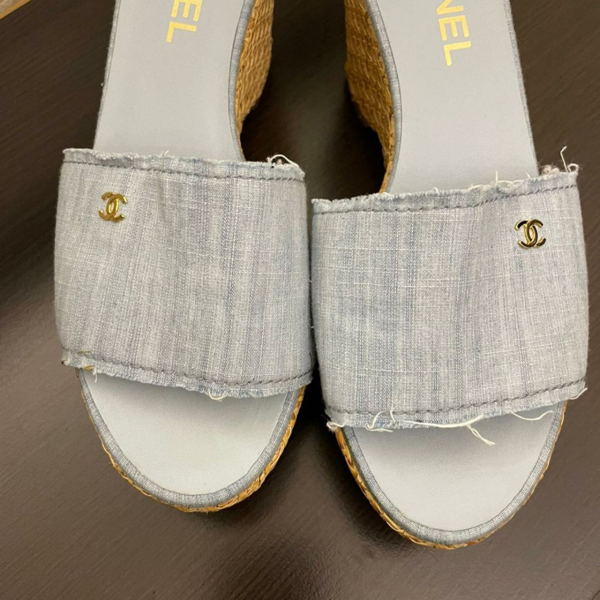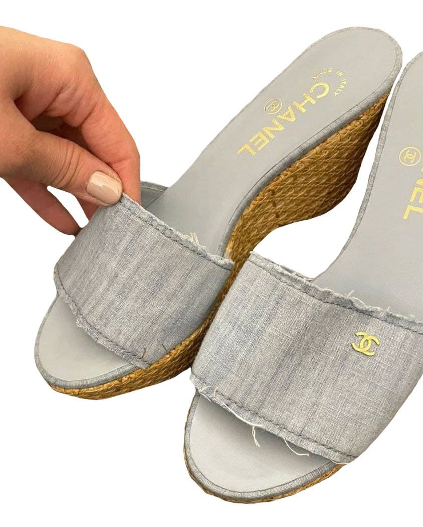 Authentic pre-owned Chanel Blue Denim Open Toe Sandals. In excellent condition.