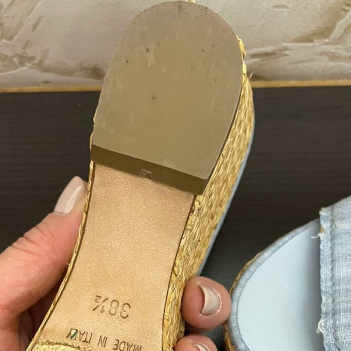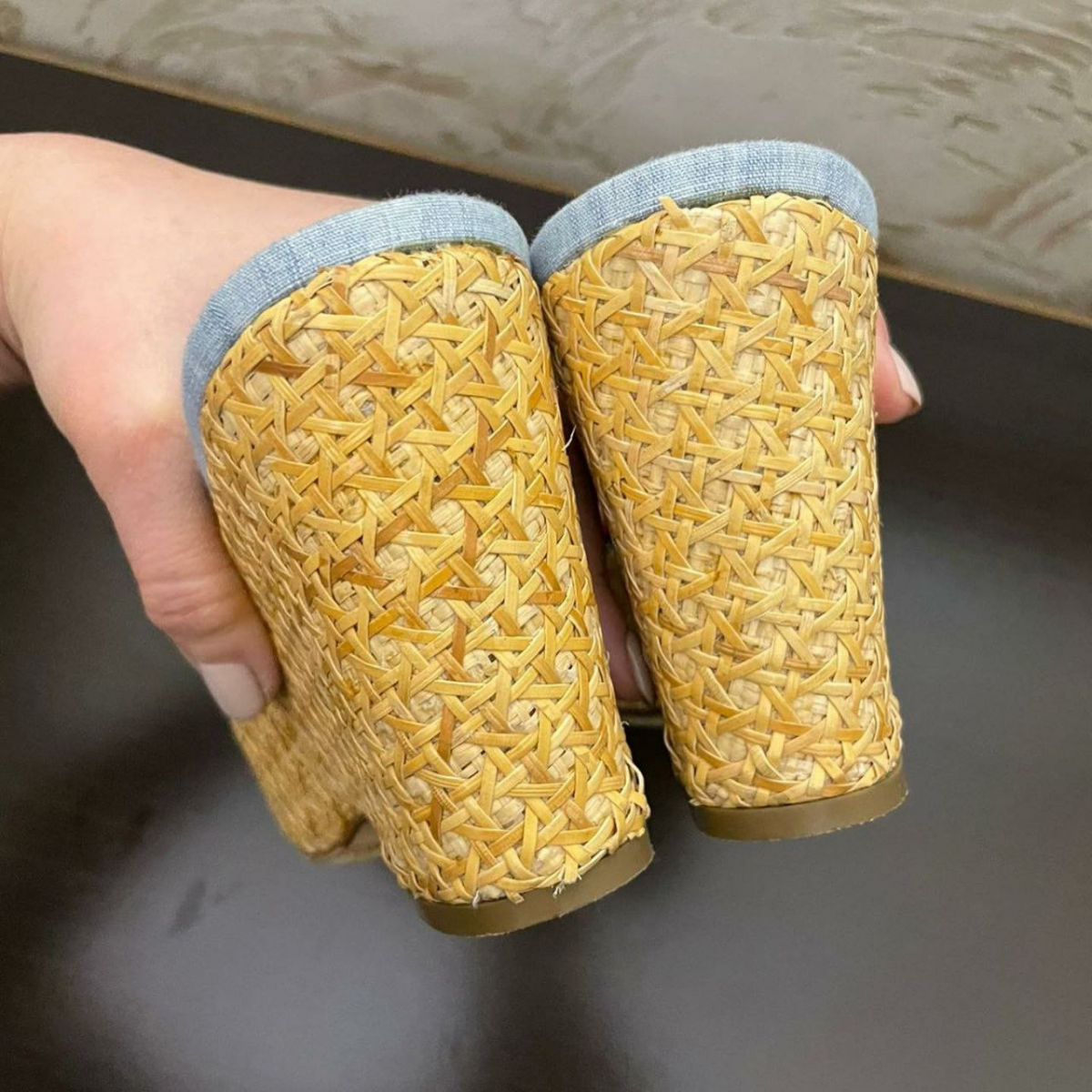 Blue Denim Open Toe Raffia Wedge Slide Sandals