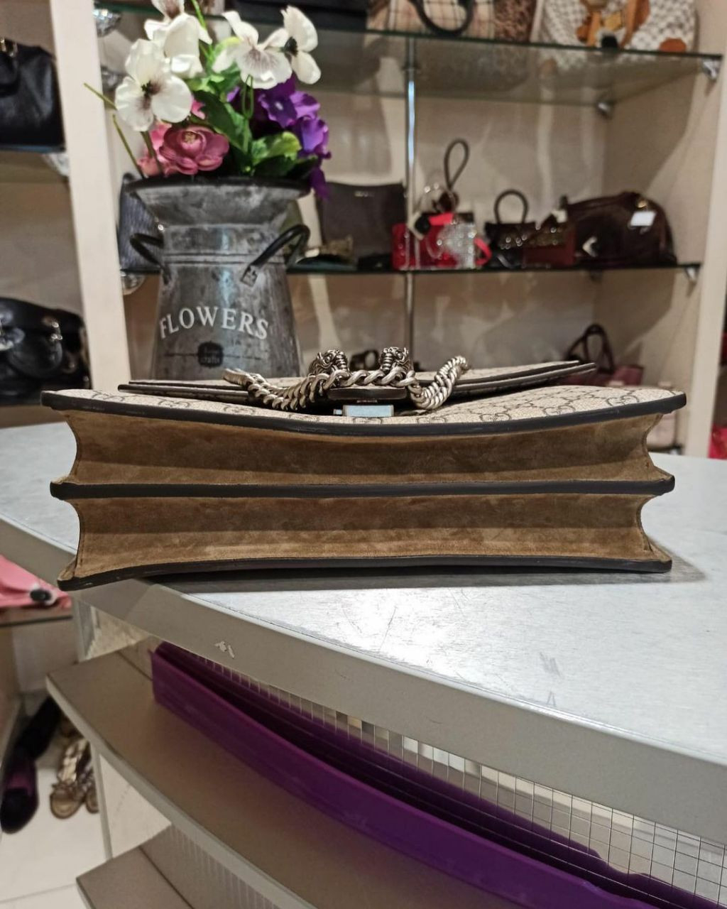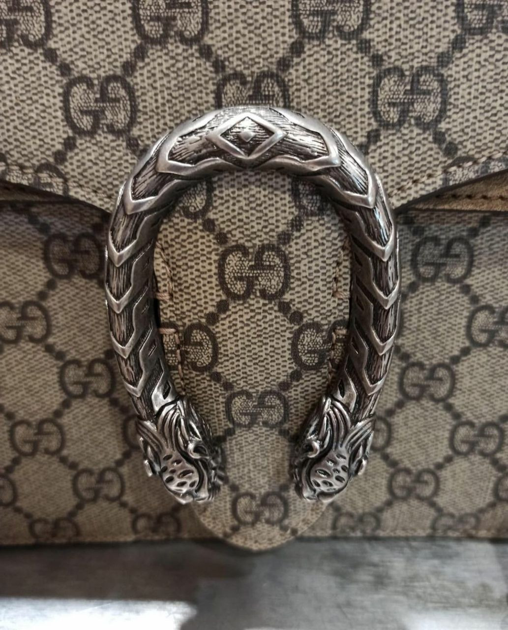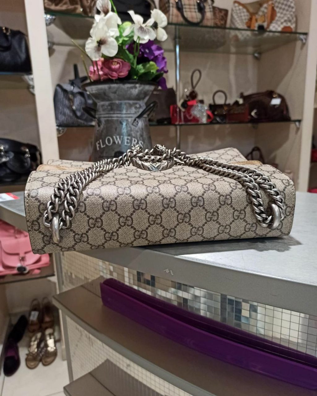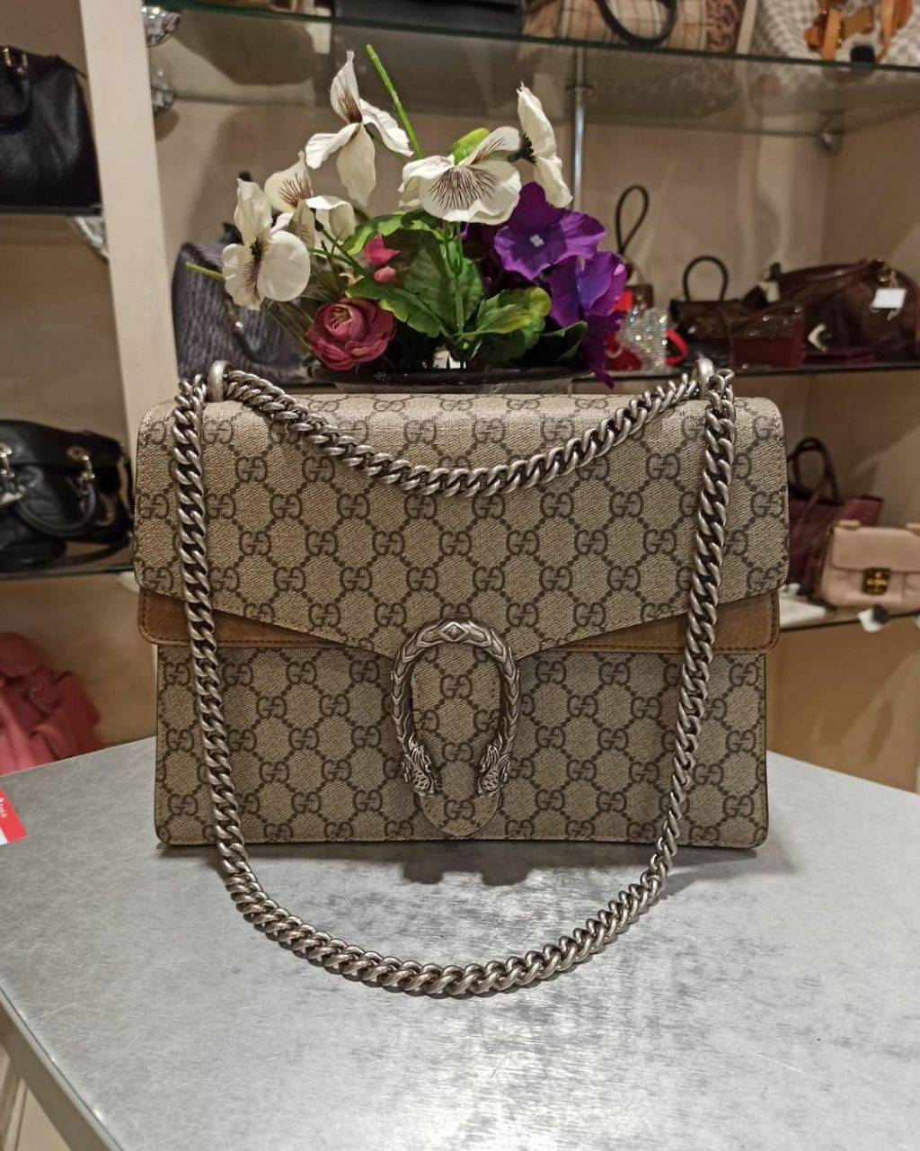 Authentic pre-owned Gucci GG Supreme Coated Canvas Medium Dionysus Shoulder Bag. Like new. Retail price 2650$. Crafted from classic GG canvas, this handbag from the Italian fashion house features an original clasp with tiger heads in antique silver tone. The accessory is completed with a chain strap, allowing to carry the product in different ways. Such an addition to the image will delight connoisseurs of fashionable and timeless designs.