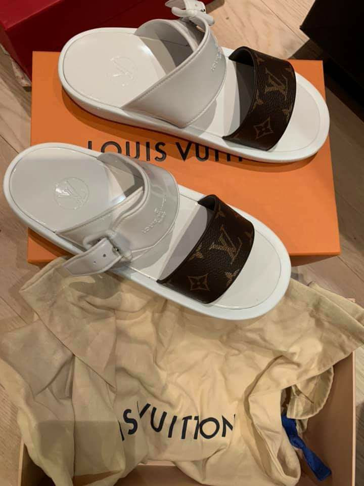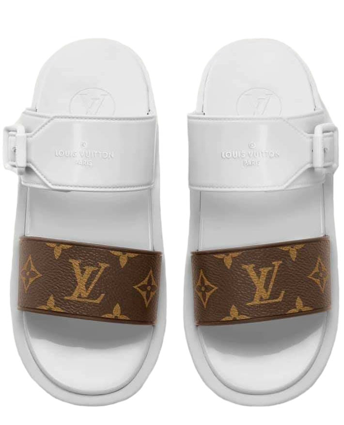 Authentic Louis Vuitton Sunbath Flat Mules. Never used.These white and brown Monogram flat mules made by the French fashion house will become an original addition to summer outfits. They are complemented by wide straps, featuring a comfortable anatomical insole and a lightweight rubber sole. This waterproof pair is a convenient choice for the beach and everyday looks or can be used indoors.